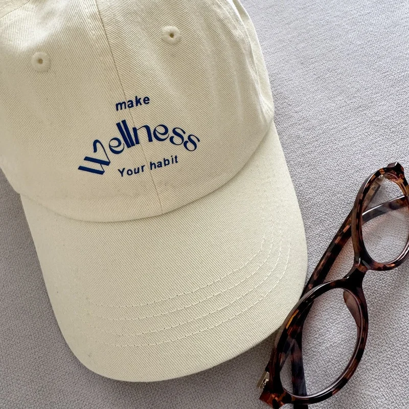 Czapka w stylu vintage, w modnym masełkowym odcieniu z granatowym nadrukiem.
